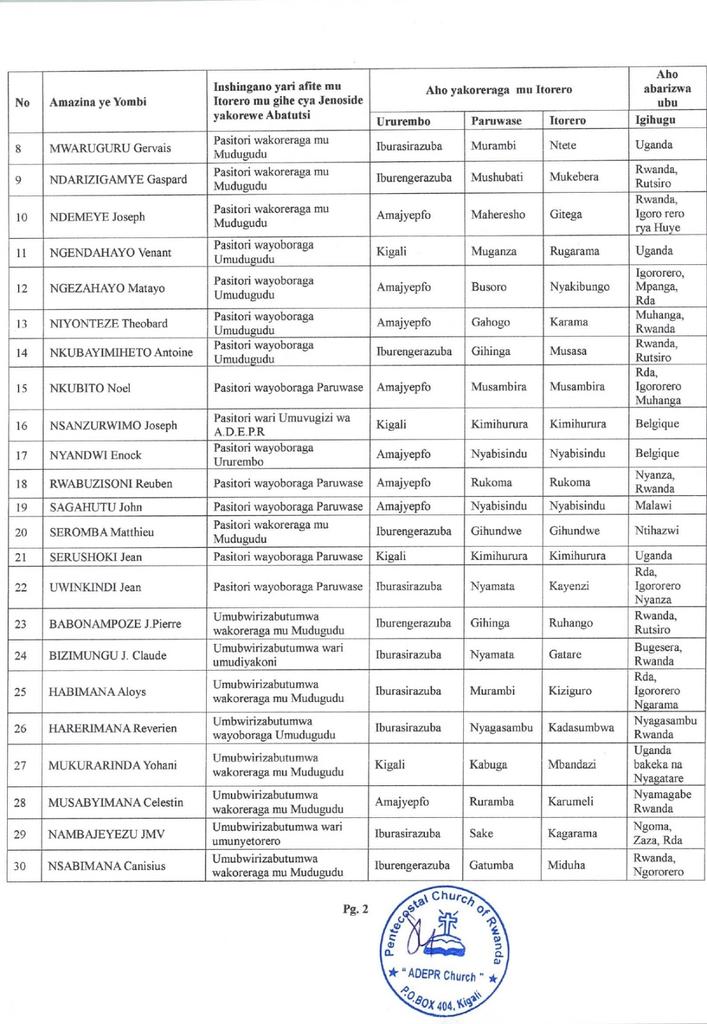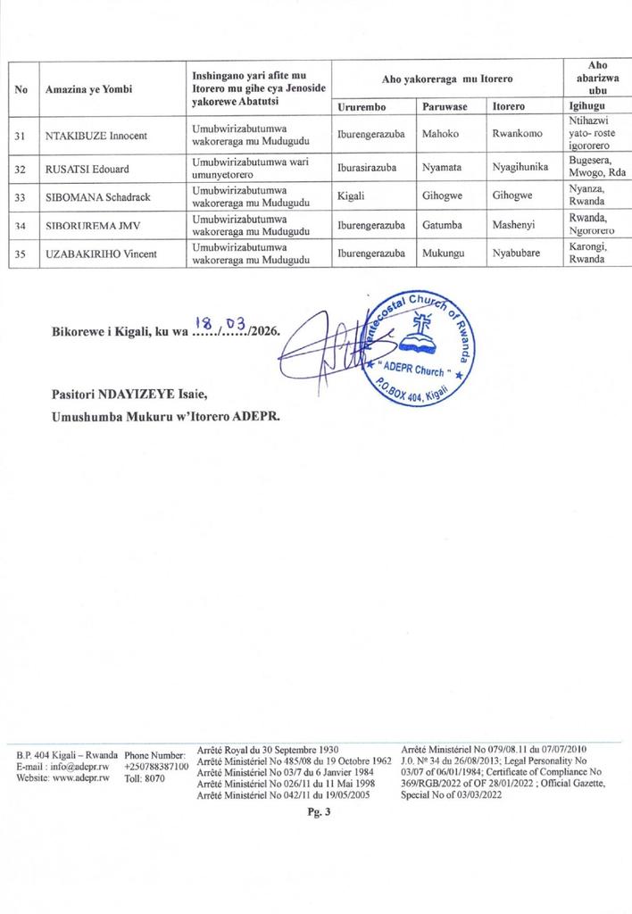 ADEPR yatangaje ko yambuye abantu 35 inshingano za gishumba n’iz’umubwirizabutumwa, nyuma yo guhamywa n’inkiko icyaha cya Jenoside yakorewe Abatutsi mu 1994.