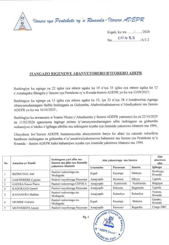 Iki cyemezo cyatangajwe ku wa 18 Werurwe 2026, gishingiye ku myanzuro y’Inama Nkuru y’Abashumba ba ADEPR yateranye inshuro ebyiri mu 2025 no mu 2026, isuzuma ibijyanye n’abari bafite inshingano z’itorero ariko barahamwe n’ibyaha bya Jenoside.