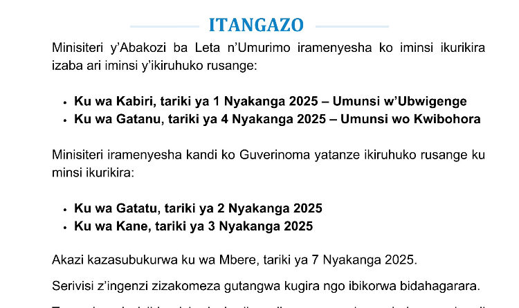 Minisiteri y’Abakozi ba Leta n’Umurimo yatangaje ko kuva ku wa Kabiri, tariki ya 1 Nyakanga 2025 kugeza ku wa Gatanu tariki ya 4 Nyakanga 2025 ari iminsi y’ikiruhuko rusange, mu rwego rwo kwizihiza Umunsi w’Ubwigenge n’uwo Kwibohora.