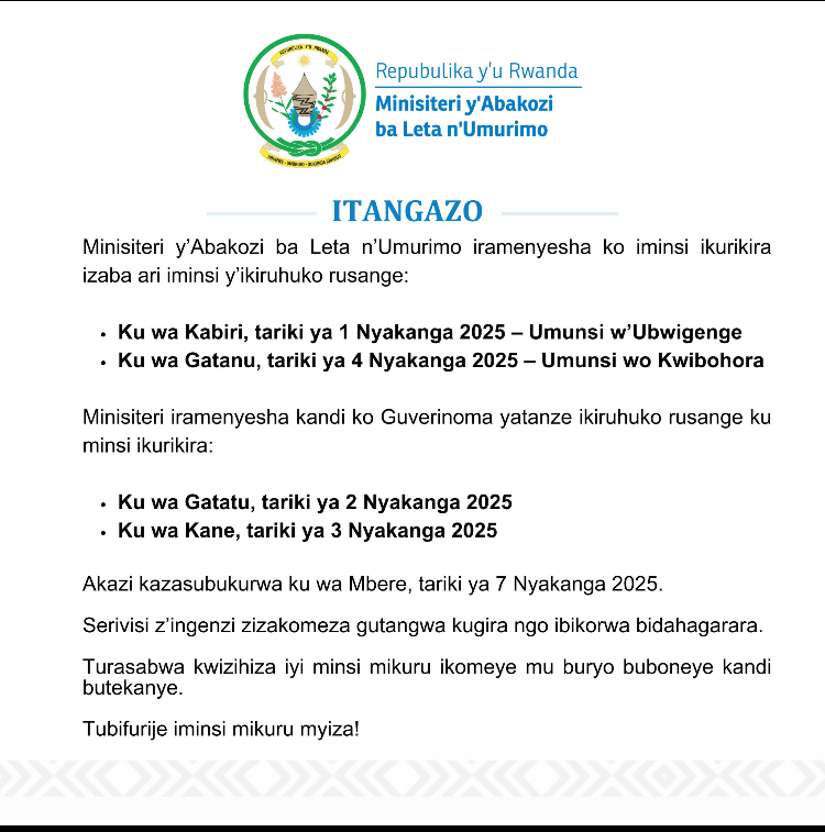 Mu itangazo iyi Minisiteri yasohoye kuri uyu wa 20 Nyakanga 2025, yatangaje ko ku itariki ya 1 Nyakanga ari umunsi w’ikiruhuko wo kwizihiza Umunsi w’Ubwigenge, na ho ku ya 4 Nyakanga ukaba Umunsi wo Kwibohora.