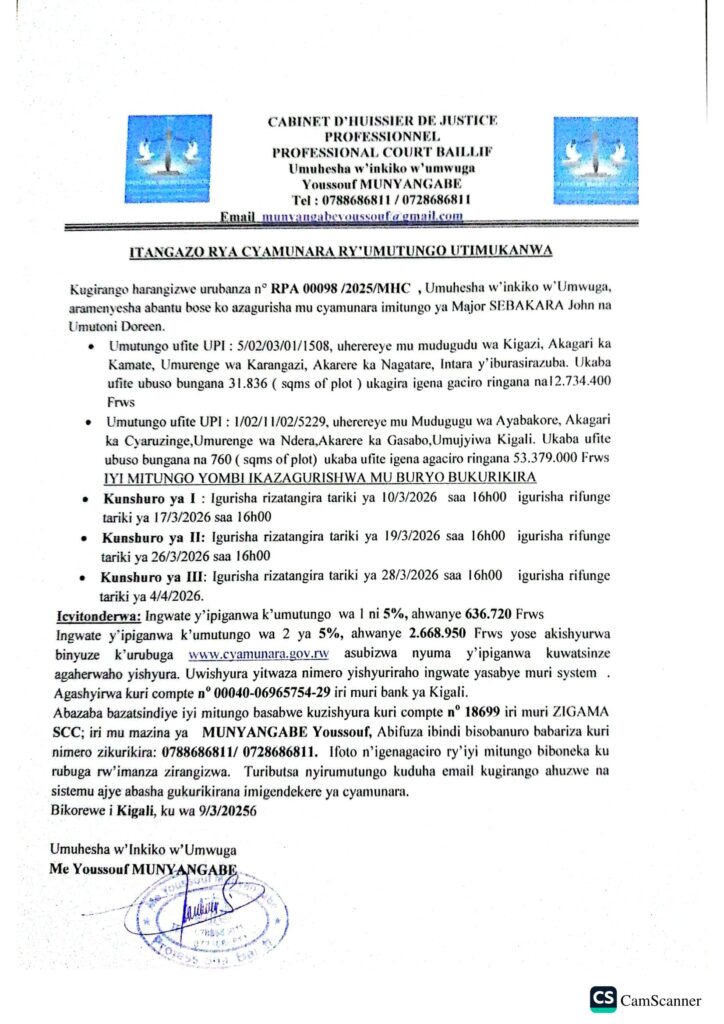 AmakuruAmatangazoUncategorized Itangazo rya cyamunara ry’umutungo utimukanwa 03/11/2026 Gasirikare Yves