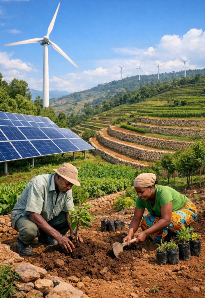 Mu ngamba u Rwanda rwashyizeho harimo kurwanya isuri haterwa amaterasi n’imirima y’indinganire, gutera amashyamba no gusubiranya ayangiritse, gukumira ikoreshwa ry’amasashe n’ibikoresho bya pulasitiki bitabora, ndetse no guteza imbere ingufu zisubira nk’izituruka ku mirasire y’izuba n’umuyaga. Izi ngamba zigamije kugabanya ihumana ry’ikirere no kurinda umutungo kamere.